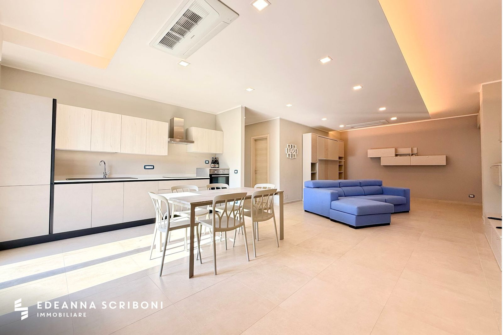 The entrance opens directly into a spacious open-plan living area, featuring a contemporary design with soft tones, recessed ceiling spotlights, and a seamlessly integrated kitchen that connects harmoniously with the living and dining zone. A welcoming and stylish environment, ideal for both comfort and conviviality.