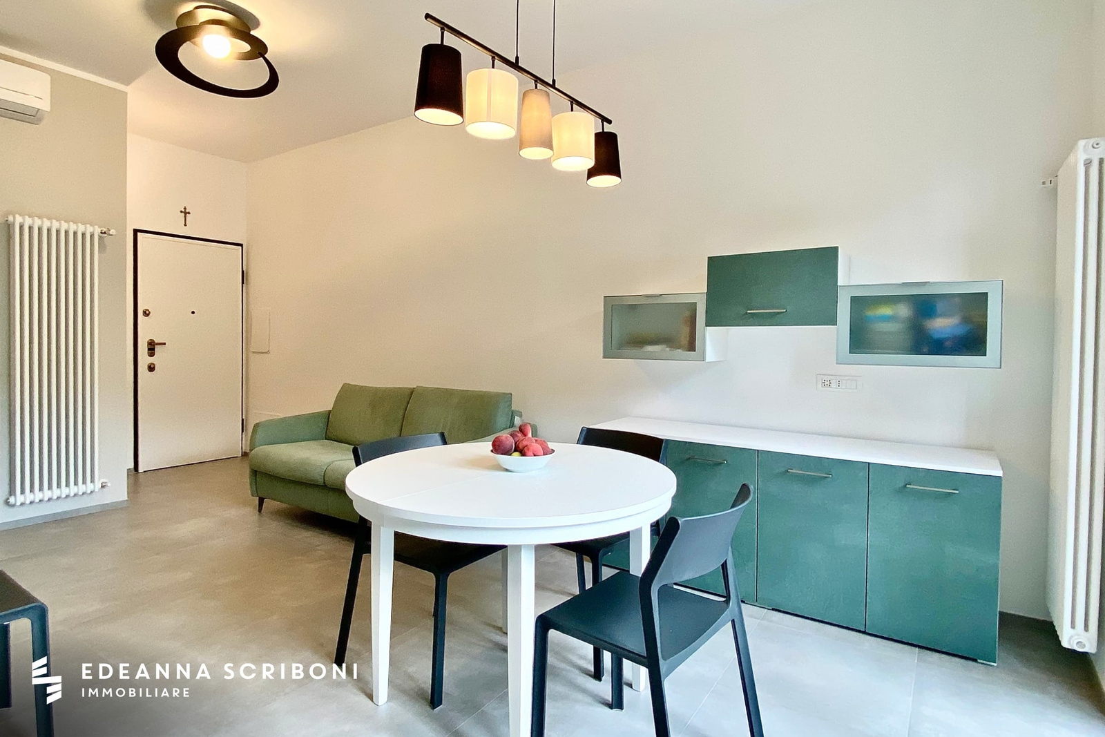 Inside, the apartment immediately presents a living room with a kitchenette, both elegant and functional. The interiors are meticulously crafted, the result of an architectural design aimed at creating a minimalist, practical, and refined space. The choice of materials and design solutions enhances the space, ensuring comfort and modern style.